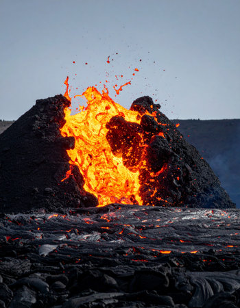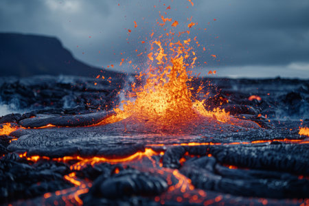 Bright orange lava cascades and erupts from the volcano, creating stunning fountains that illuminate the darkened surroundings, showcasing nature's raw power against a twilight sky.