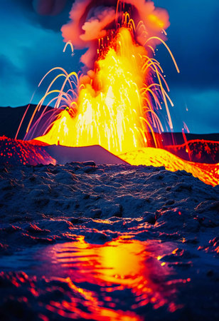 A stunning volcanic eruption lights up the night sky with fiery lava and sparks creating a mesmerizing display of natures power and beauty.
