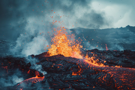 Volcanic eruption unfolds with vibrant lava streams cascading into an empty terrain, illuminating the surroundings with intense heat and smoke as ash billows into the atmosphere.