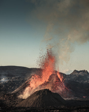 AI Generated. Erupting volcano spewing ash and lava during twilight in a dramatic landscape