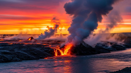 Majestic Volcanic Eruption Meeting Ocean Waves, Dramatic Lava Flow and Steam Clouds Over Turbulent Sea AI Generative