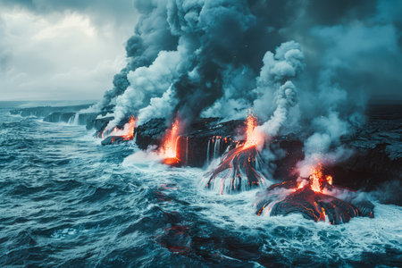 Witness the breathtaking intersection of fire and water as lava cascades into the sea, forming new landforms.