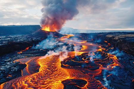 High aerial view capturing the contrast between fiery lava flows and dark volcanic ash. AI generated.