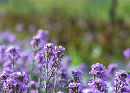 Pretty wallflowers with pink and purple petals in a garden with soft focus