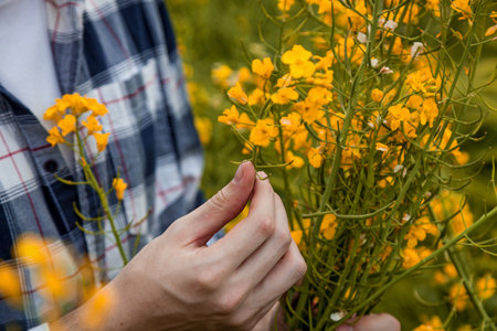 Close-up of a persons hands carefully examining bright yellow wildflowers in a lush green meadow, wearing a checkered shirt