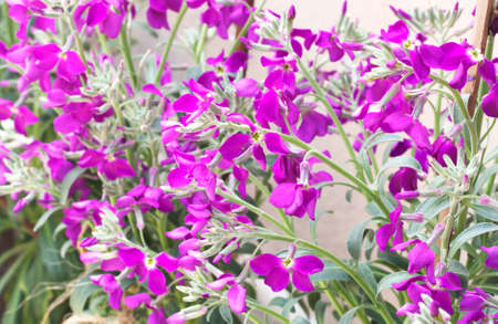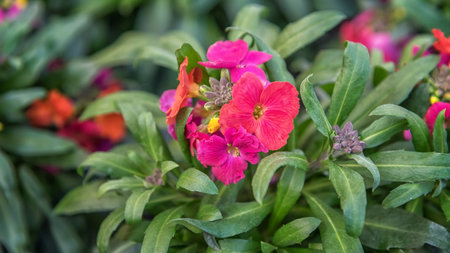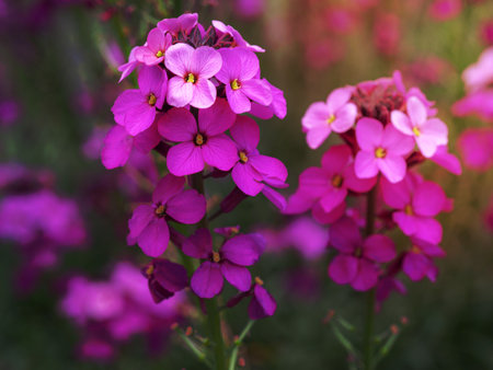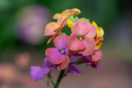 Pretty wallflowers with pink and purple petals in a garden with soft focus