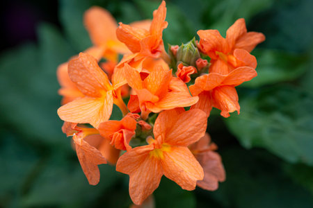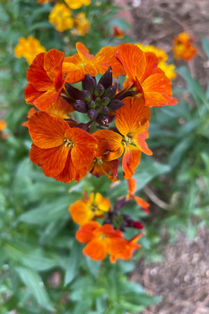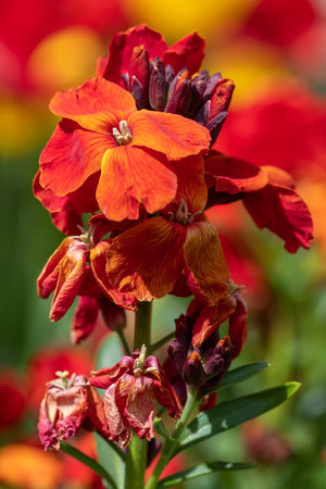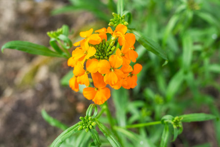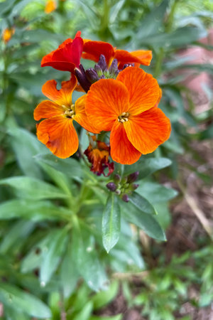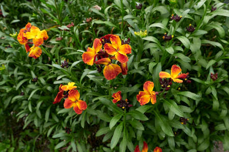 Bright beautiful perennial flower Erysimum cheiri with an inflorescence of orange opened flowers and buds.