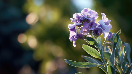 A sunlit portrait of a single Matthiola , photographed outdoors on a clear, breezy day. Fresh, crisp air renders vivid detail in the leave veins glowing with gentle backlight. The background falls into a soft natural bokeh of greenery, colors true-to-life, organic beauty in pure sunlight.