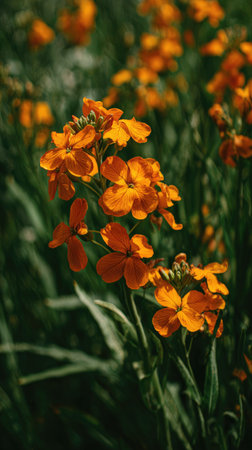 Close up of orange wallflowers (erysimum cheiri) in bloom
