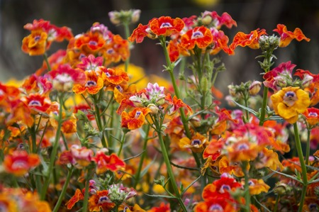 Floral background. Blooming purple and orange plants close-up. Selective focus