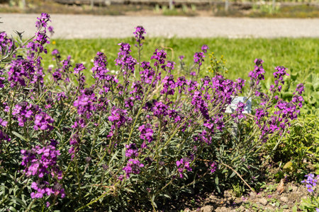 Flowerbed with Erysimum linifolium Bowles Mauve Perennial Wallflower on a spring day