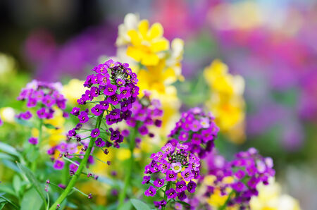 Soft focus image of small yellow flowers of aurinia saxatilis in the spring time in the garden. Common names include basket of gold, goldentuft alyssum, golden alison, gold-dust, rock madwort