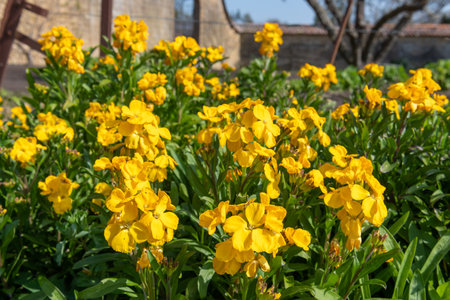 Erysimum aka Wallflower flowers outdoors. Bright and perfumed spring garden plants. Defocussed background.