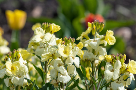 Erysimum cheiri, commonly known as a wallflower, in the spring sunshine