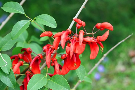 The beauty of the bright red coral bean flowers. The bark, leaves, roots and seeds of the plant with the scientific name Erythrina fusca contain alkaloid compounds.