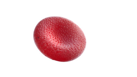 A detailed, 3D rendered close-up of a single red blood cell is shown against a black background. The characteristic biconcave disc shape is evident, with a slightly lighter, indented center. The surface of the cell is textured with numerous small, raised bumps or vesicles.