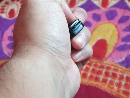 black gsm modem in the fingers of a hand against the background of a person in a black sweatshirt