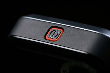 Macro shot of a plastic button with a red power symbol, sewn into modern clothing.