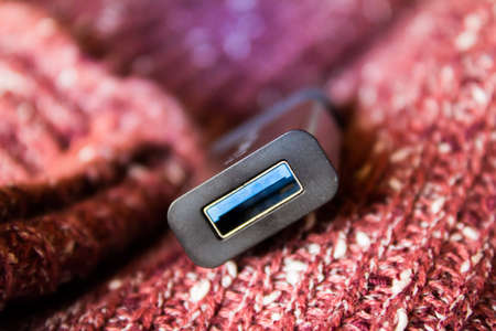 Image of a usb cable plugged into a laptop port. The concept of modern ultra-fast ways of transmitting information. Mixed media