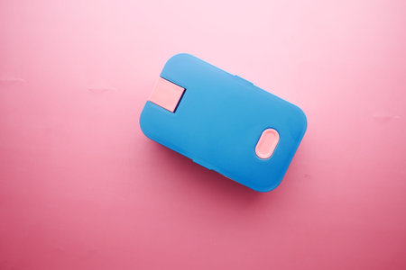 Toy trash can with charger on pink blue background. Recycling, eco concept. Top view, flat lay