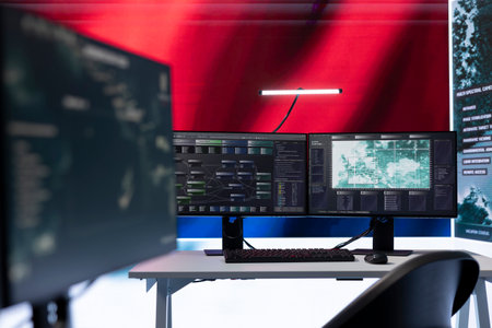 Federal agency command center equipped with surveillance and satellite system overseeing threats or danger on a world map. Military control room headquarters with a dashboard.