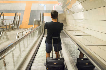 Back view of college student with backpack going up airport escalator holding travel bag in his hand - journey concept