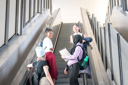 Group of friends talk on smartphones while standing on escalator. Modern people with cell phones outdoor. Mobile communication technology. High angle view