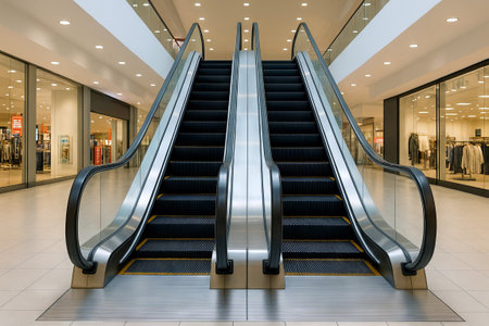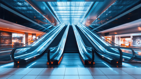 Shiny escalator in modern shopping mall with clothing stores and bright lighting. concept of urban consumer lifestyle, retail shopping experience, indoor architecture.