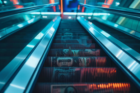 Vibrant Escalator With Red and Blue Lights in Subway Station, An escalator with currency symbols depicting the rising trend in prices, AI Generated