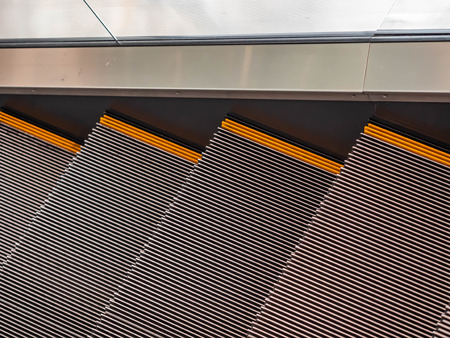 Gray escalator steps with orange lines close-up. Stopped escalator.