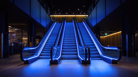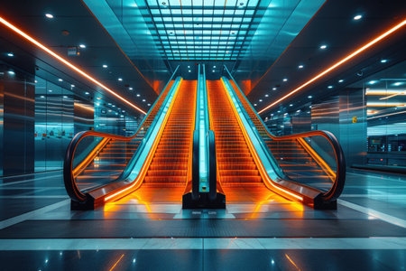 A stunning view of modern escalators in an illuminated urban transportation hub, showcasing sleek design and vibrant lighting effects for a dynamic environment.