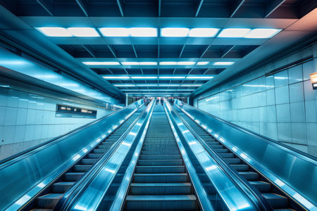 A striking view of sleek escalators leading upward within a contemporary subway station, illuminated by soft blue lights, creating a calming atmosphere for commuters.