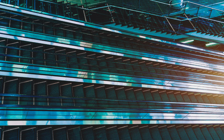 Escalators in shopping center. Empty moving staircase up and down in office building, shopping mall or subway station.