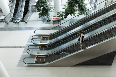 High view of Caucasian female executive using mobile phone while moving down on escalator in modern office