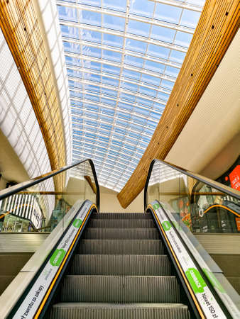 Wroclaw, Poland - September 18 2020: Long escalator to first floor of mall with beautiful glassy roof over it
