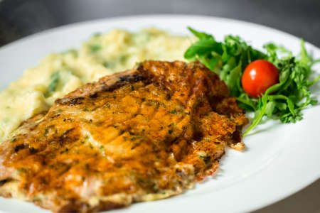 Spicy chilli chicken fillets served with mashed potatoes and salad of tomatoes, cucumbers and onions, tasty food