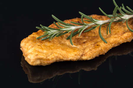 Fried breaded chicken white meat with rosemary branch above black background table with reflections.