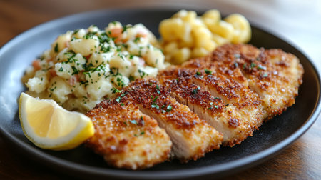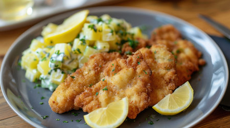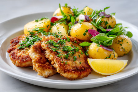 A delicious plate featuring crispy chicken fillets and a refreshing potato salad, garnished with fresh lemon, perfect for a satisfying meal.