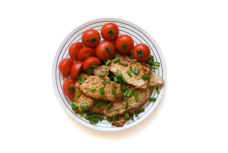 Fried meat with tomatoes on a plate.