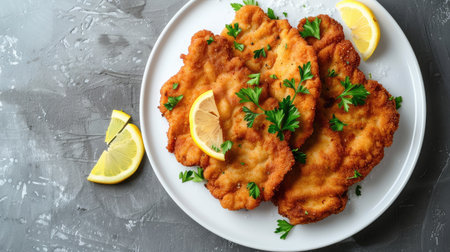 Crispy schnitzel with lemon slices and fresh parsley on white plate, viewed from above on stone surface.