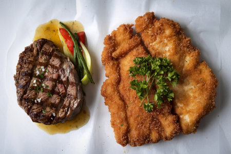 a fried breaded wiener schnitzel and a cooked meat steak