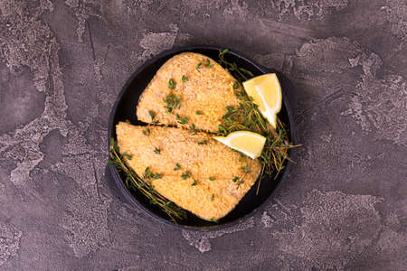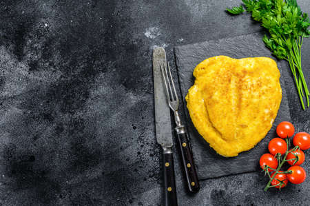 Homemade Breaded German Weiner Schnitzel. Black background. Top view. Copy space.