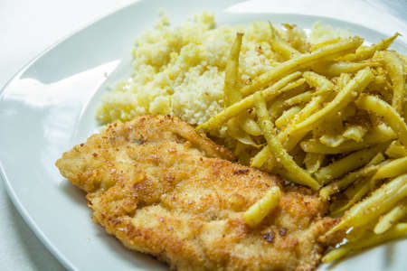 Polish dish with a cutlet, string bean and bulgur