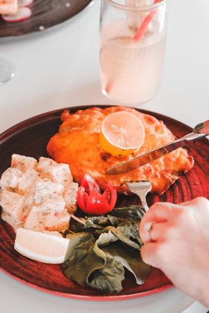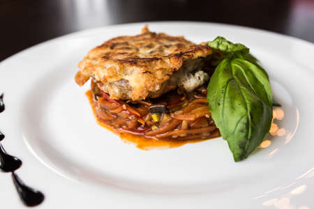 European international fusion cuisine, a beautiful dish on a white plate decorated with herbs and vegetables. a professional chef has prepared a delicious meal. Vegetarian food and meat restaurant dishes. fast food.