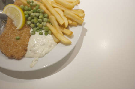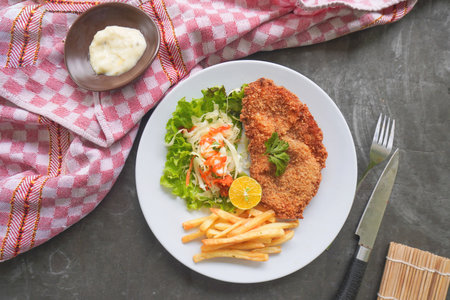 Chicken schnitzel is made from chicken breast, served with French fries, lemon, vegetable salad and sauce, mayonnaise on plate. flat lay