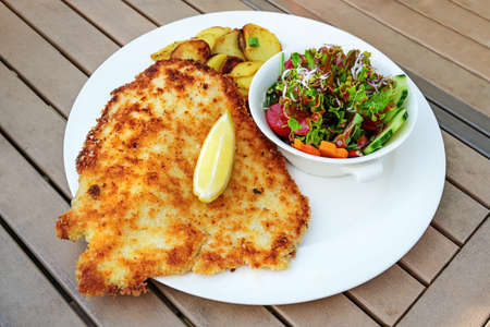 Wiener schnitzel with lemon slice, salad and fried potato on a wooden garden table in an outdoor restaurant, selected focus, narrow depth of field