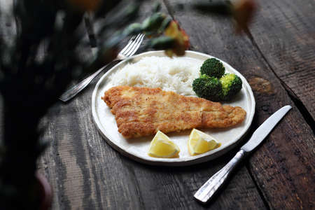 Diner. Fish in breadcrumbs fried with rice and broccoli.