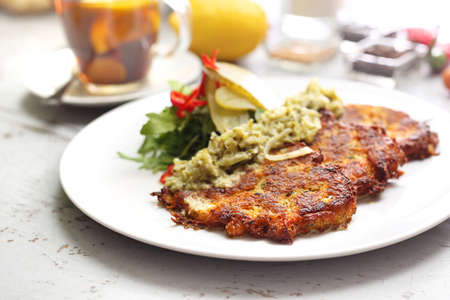 Chicken schnitzel with sauce, fried potatoes and lemon in a plate