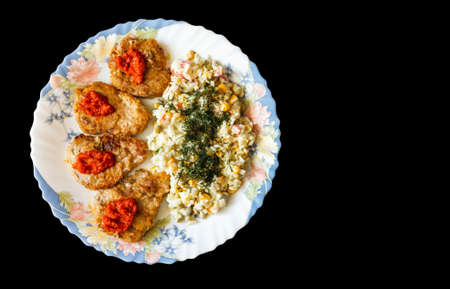 Chicken cutlets on a white plate. Dark background. Top view.