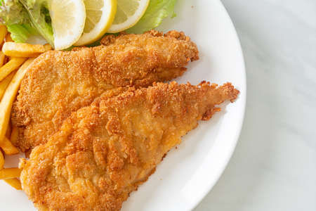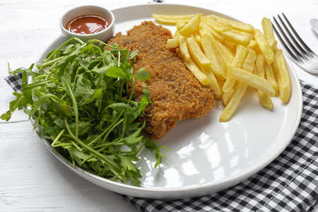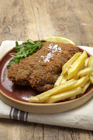 Homemade Breaded Weiner Schnitzel with Potato Chips - Fried Chicken with french fries - European food style